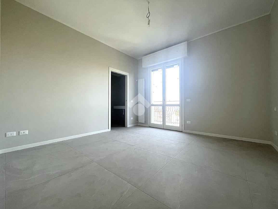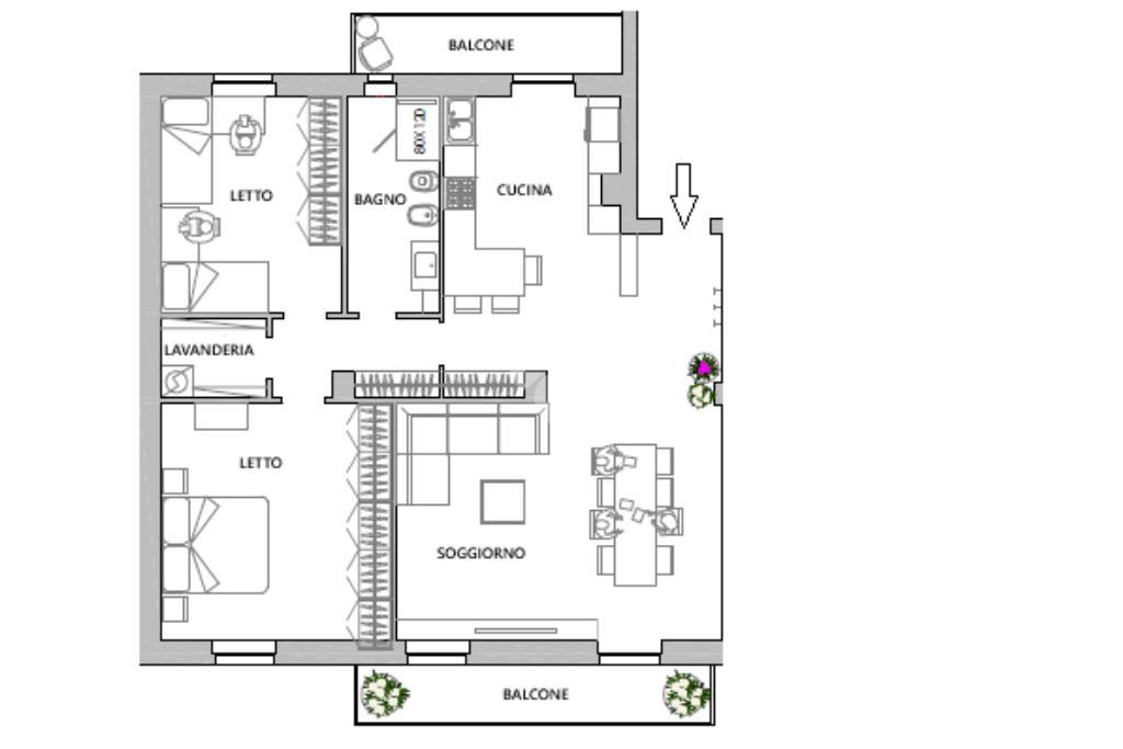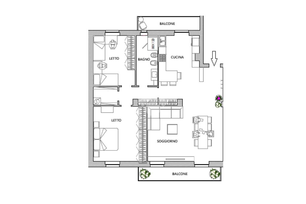 Ingresso sul soggiorno in affaccio sul balcone, cucina indipendente in affaccio sul secondo balcone, una camera da letto matrimoniale, una camera da letto doppia, bagno e lavanderia.